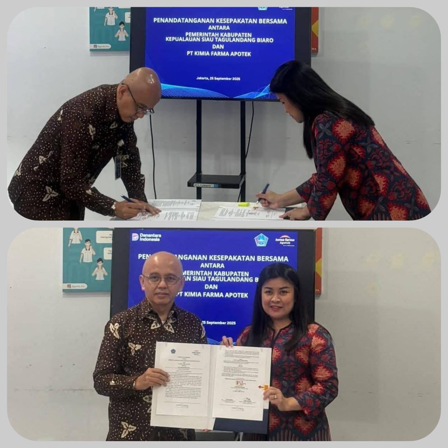 7PMNEWS.ID, SITARO– Langkah besar di bidang kesehatan akhirnya terwujud di Kabupaten Kepulauan Sitaro. Kamis, 25 September 2025, menjadi momen bersejarah dengan ditandatanganinya kesepakatan bersama antara Pemerintah Kabupaten Kepulauan Sitaro dan PT. Kimia Farma Apotek (KFA). Penandatanganan ini langsung dihadiri oleh Bupati Sitaro, Chyntia Ingrid Kalangit, S.K.M., sebagai bukti nyata komitmen pemerintah dalam menghadirkan pelayanan kesehatan yang lebih baik.
