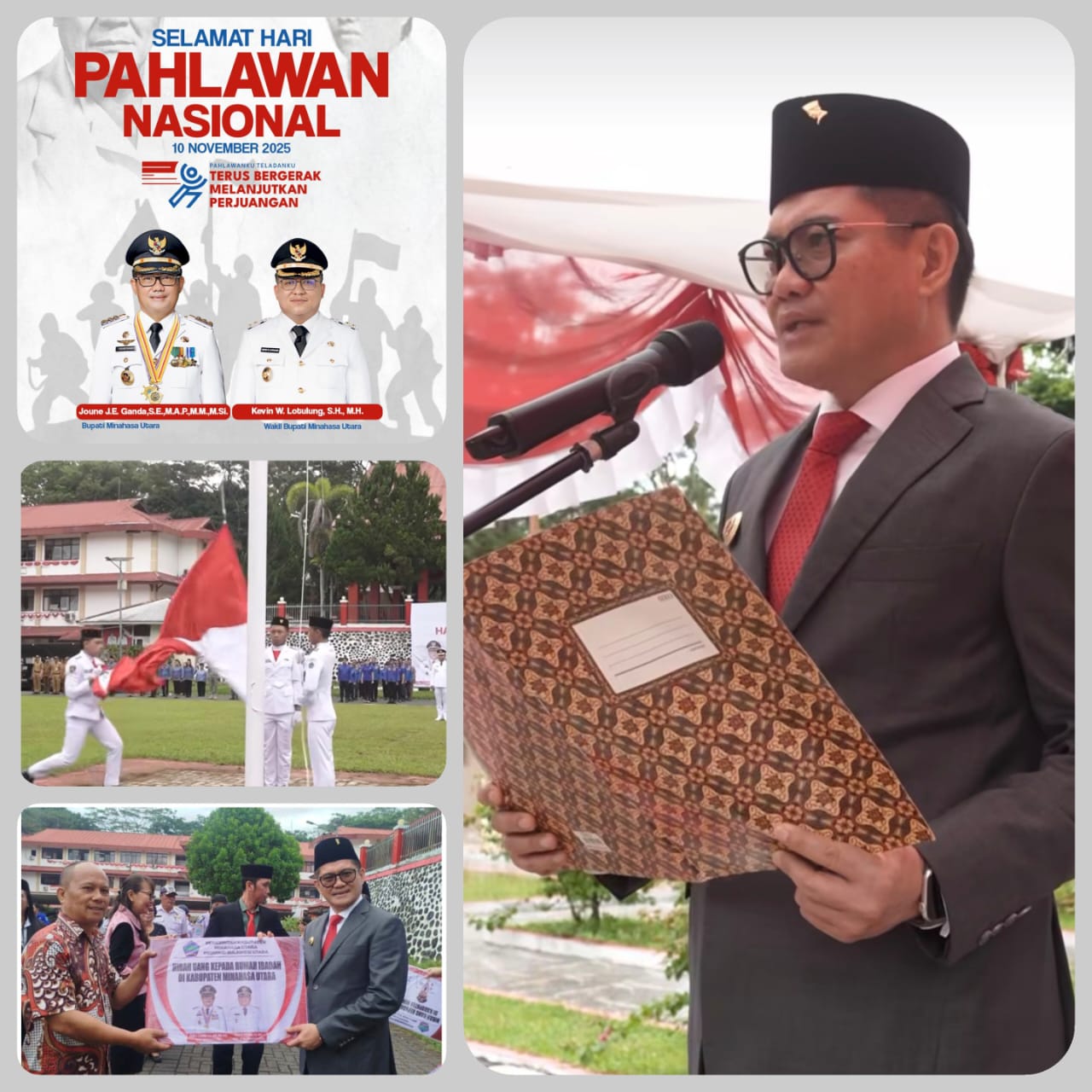 7PMNEWS.ID, AIRMADIDI-Bupati Minahasa Utara Joune James Esau Ganda menjadi Irup dalam Upacara Bendera Peringatan Hari Pahlawan 10 November di Lapangan Upacara Kantor Bupati Minut, Senin pagi (10/11).