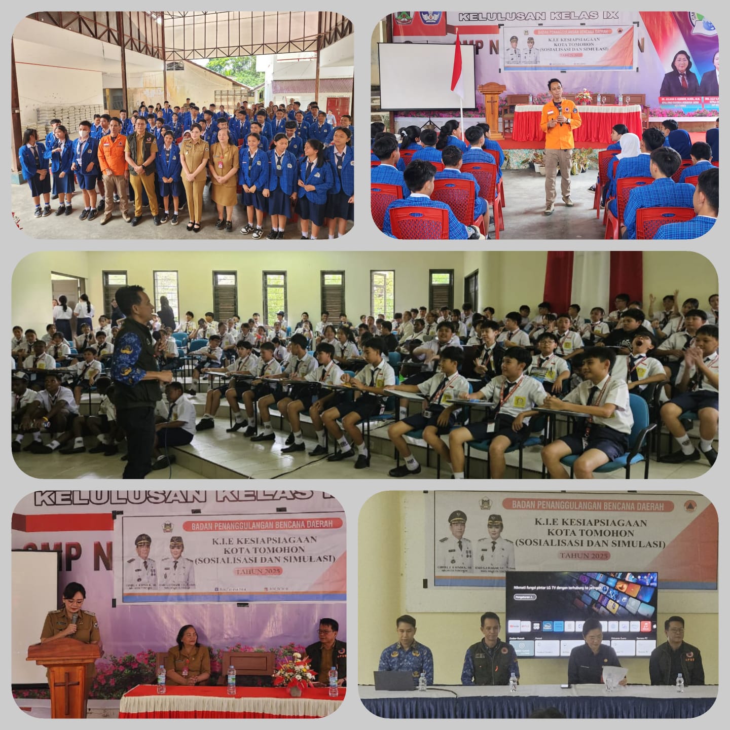 Kepala Sekolah SMPN 1 Dra Lilly Mangoendap MPd menyambut baik pelaksanaan sosialisasi dan simulasi di sekolah-sekolah. Turut hadir pejabat dan pegawai dari BPBD Kota Tomohon, peserta didik dan tenaga pendidik serta semua unsur dalam sekolah.
