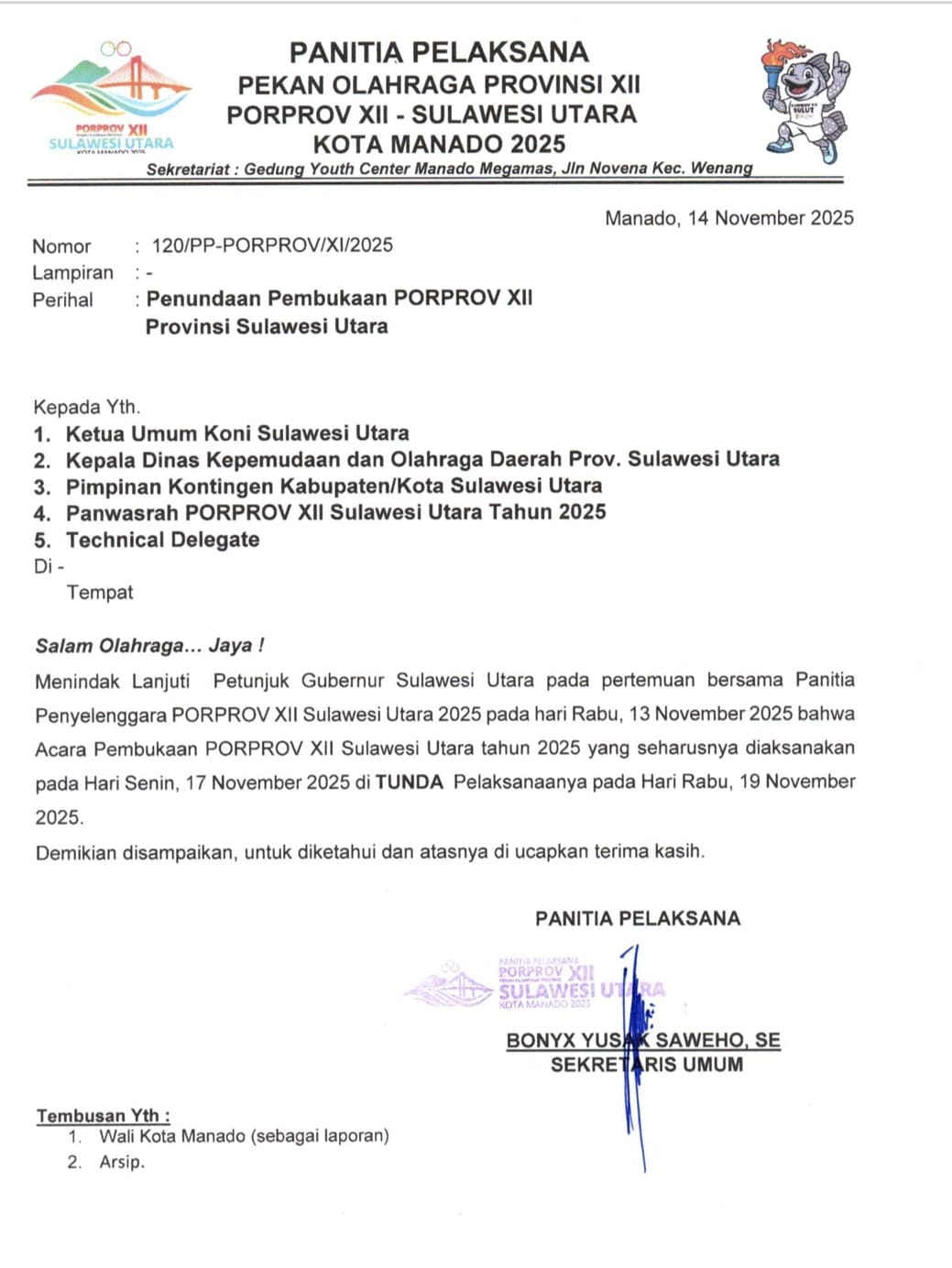 Penundaan itu tertera lewat surat penundaan Pembukaan Porprov dari Panitia Pelaksana yang ditandatangi Sekretaris Umum Panitia Bonix Saweho ke Ketua Umum KONI Sulut, Kadispora Sulut, Pimpinan Kontingen Kabupaten/Kota, Panswarah dan Techical Delegate tertanggal 14 November 2025.