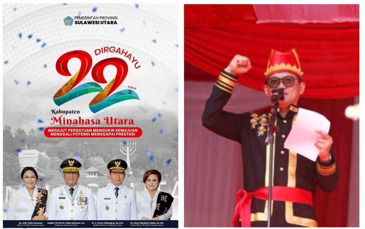 7PMNEWS.ID, AIRMADIDI-Kabupaten Minahasa Utara hari ini (20/11) genap memasuki usia ke-22 tahun. Masih berusia muda dibandingkan dengan Kabupaten dan Kota lainnya di Sulut namun Kabupaten Minahasa Utara terus berlari kencang dengan sederet pretasi mentereng yang diukir. Namun bagi Bupati Joune James Esau Ganda saat merefleksikan 22 Tahun daerah tercintanya, prestasi bukan tujuan akhir. ‘’Momentum ini menjadi referensi atas perjalanan kerja keras dan semangat gotong royong dalam membangun daerah yang kita cintai bersama. Berbagai capaian dan prestasi bukan sekadar penghargaan namun harus memberi dampak yang nyata bagi kesejahteraan rakyat,’’ pesan Bupati enerjik itu.