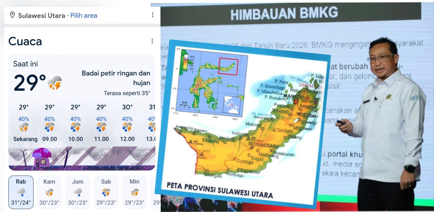 7PMNEWS.ID, JAKARTA-Badan Meteorologi, Klimatologi, dan Geofisika (BMKG) baru saja merilis kondisi cuaca secara nasional yang berlaku sepekan kedepan. Secara umum, wilayah di Sulawesi Utara relatif stabil sepanjang satu minggu kedepan, meski BMKG mengimbau masyarakat untuk tetap meningkatkan kewaspadaan terhadap potensi peningkatan curah hujan di sejumlah wilayah Indonesia menjelang periode Natal 2025 dan Tahun Baru 2026. Aktifnya Monsun Asia menjadi pemicu utama meningkatnya suplai massa udara basah yang diprediksi akan berdampak pada mobilitas tinggi masyarakat di akhir tahun. Dari sejumlah daerah di Tanah Air yang terkena dampak tersebut, seluruh wilayah Sulut, relatif aman sesuai rilis terbaru BMKG tersebut.