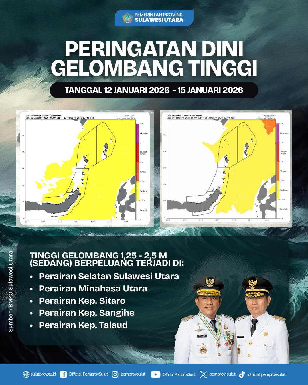 7PMNEWS.ID, MANADO-Masyarakat di Minahasa Utara, khususnya yang bermukim di sepanjang pesisir pantai dihimbau untuk waspada sejak 12 Januari hingga 15 Januari mendatang. Pemprov Sulut dalam rilisnya yang beredar luas mengeluarkan Peringatan Dini Gelombang Tinggi Tanggal 12 Januai 2026-15 Januari 2026.
