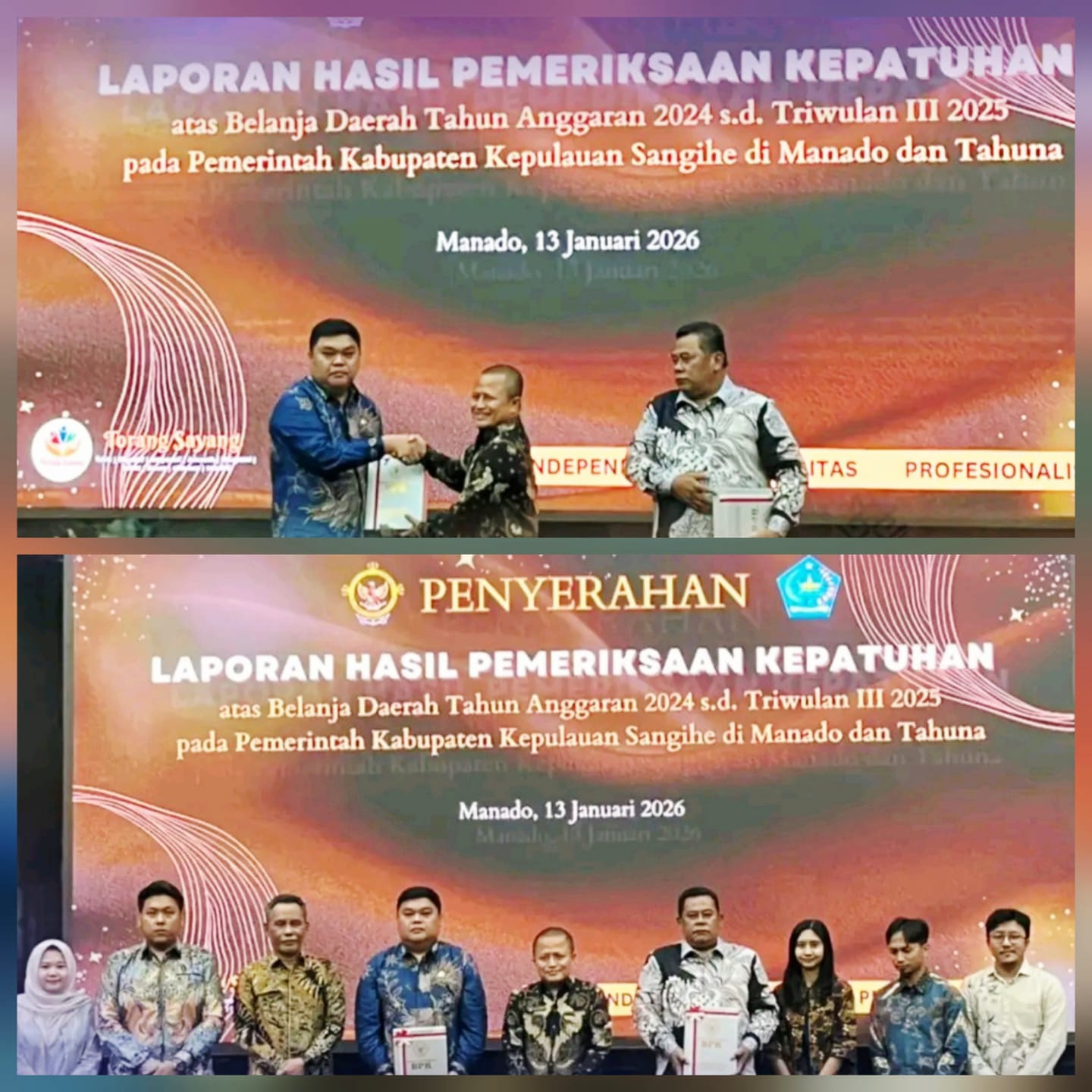 Laporan Hasil Pemeriksaan tersebut diserahkan oleh Kepala BPK RI Perwakilan Provinsi Sulawesi Utara, Bombit Agus Mulyo, S.E., M.M., Ak., C.A., ERMAP, GRCP, GRCA, CSFA, kepada Pemerintah Kabupaten Kepulauan Sangihe dan diterima langsung oleh Wakil Bupati Kepulauan Sangihe, didampingi oleh Sekretaris Daerah serta anggota DPRD Kabupaten Kepulauan Sangihe.